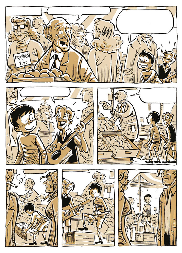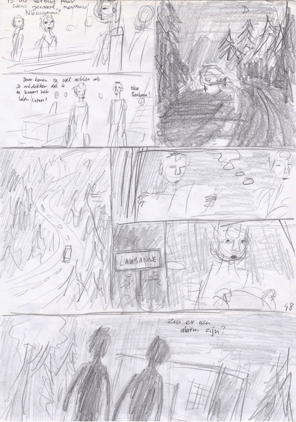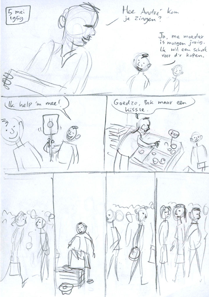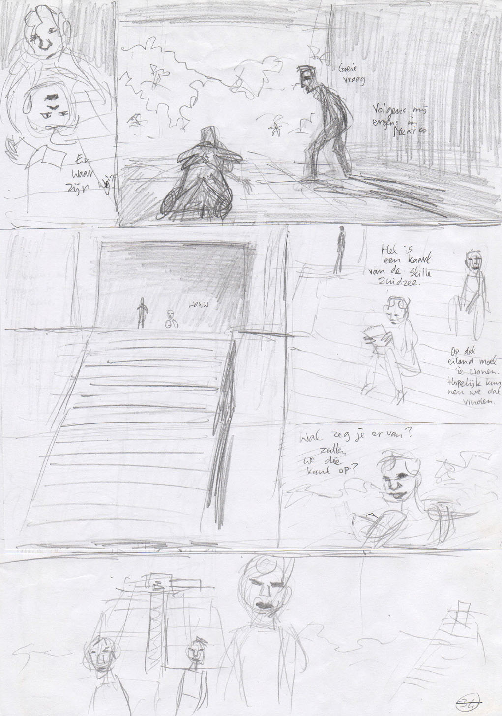 Links: pagina uit mijn scenario. Rechts de uiteindelijke uitwerking door Ben Westervoorde.